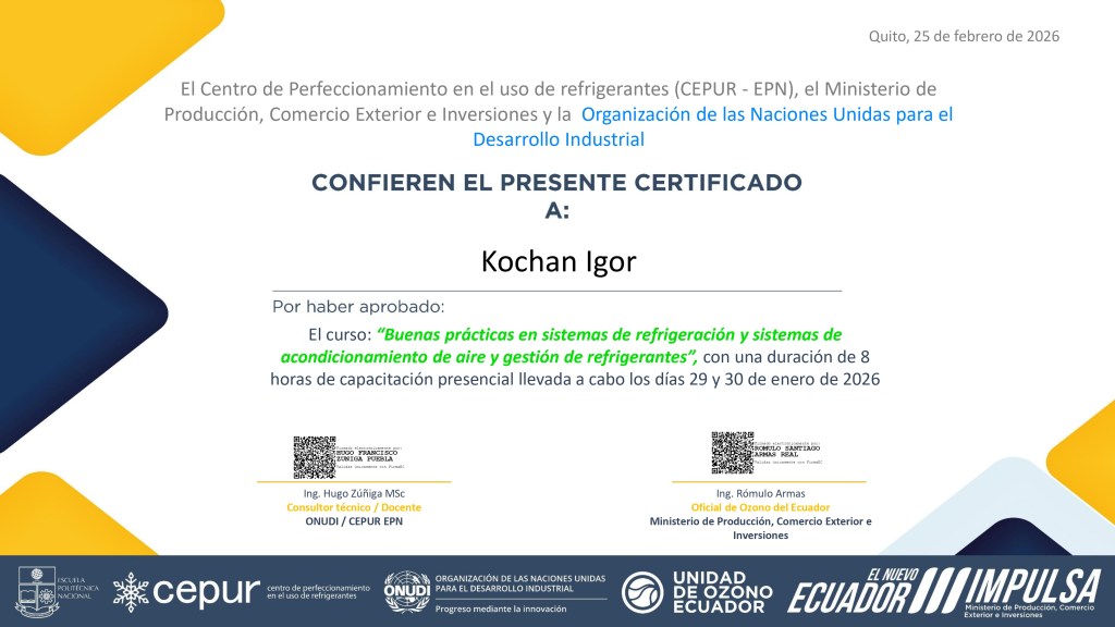 Certificado de CEPUR «Buenas prácticas en sistemas de refrigeración y sistemas de acondicionamiento de aire y gestión de refrigerantes»